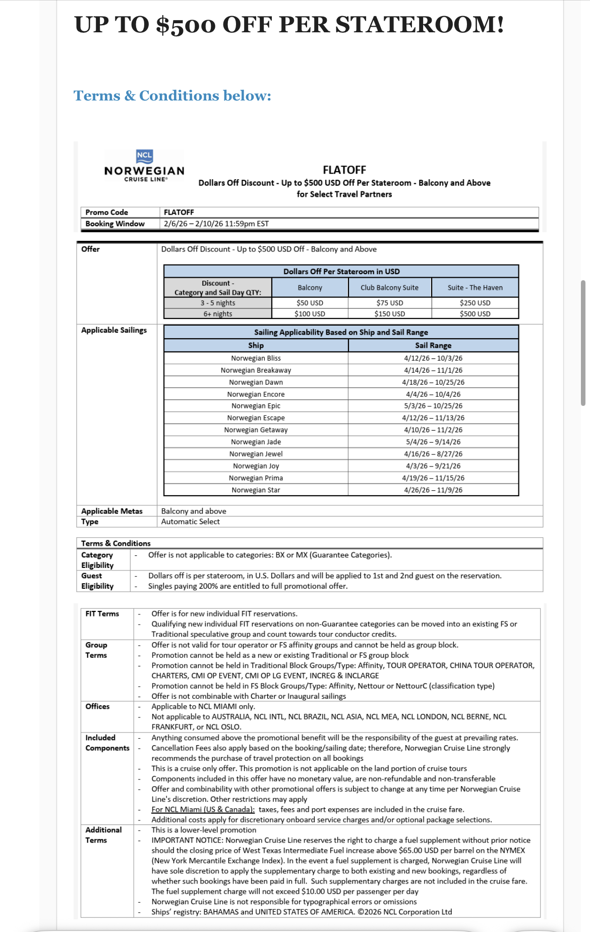 NCL is running a very limited-time flash sale for top agencies! Save up to $500 per stateroom on 12 different sailings.